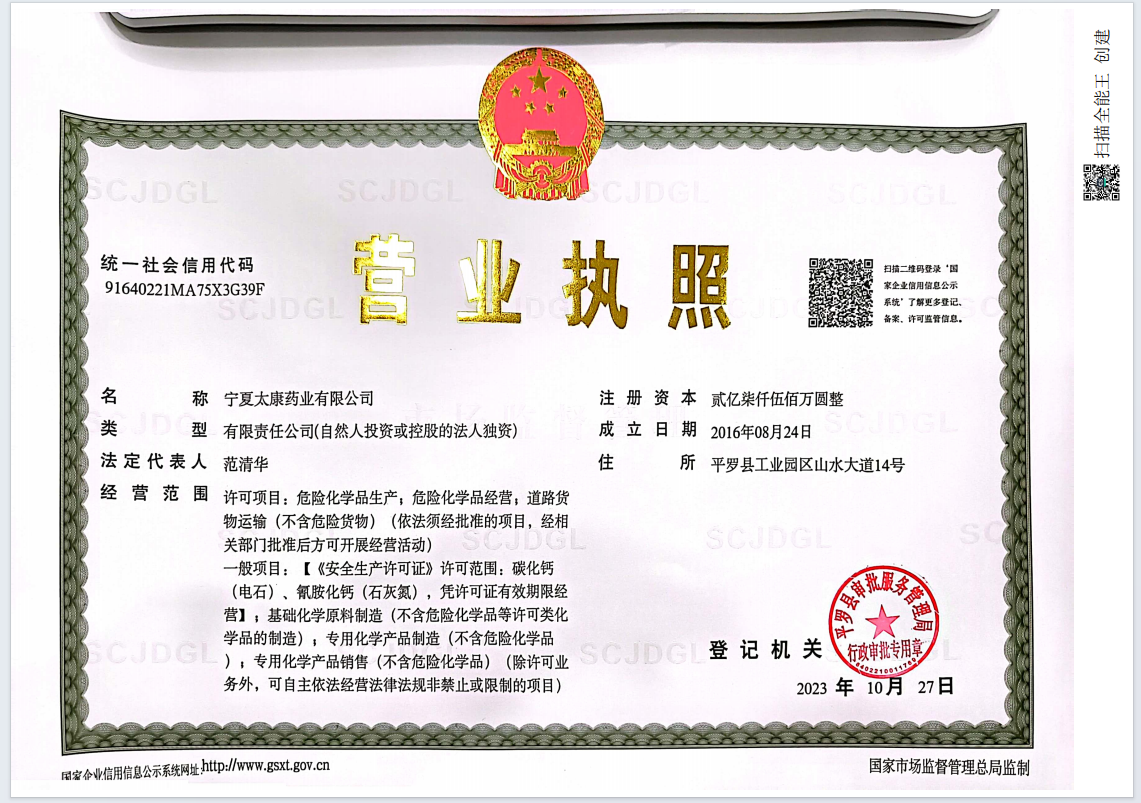 寧夏太康藥業(yè)有限公司是寧夏大地循環(huán)發(fā)展股份有限公司全資控股企業(yè)。工廠占地面積1600畝,擁有固定資產(chǎn)6.74億元人民幣,總裝機容量16萬KVA,是寧夏回族自治區(qū) 40家大型工業(yè)骨干企業(yè)之一。企業(yè)現(xiàn)有員工1100余人,其中主要管理人員134人,專業(yè)技術人員112人,高級工程師5人、工程師10人、經(jīng)濟師3人、技師15人,公司擁有年生產(chǎn)能力:醫(yī)藥中間體產(chǎn)品-雙氰胺6WT、單氰胺5000T、一水肌酸3000T、氨基胍碳酸鹽3000T;化工基礎原料產(chǎn)品-石灰氮22.5WT電石12WT。
